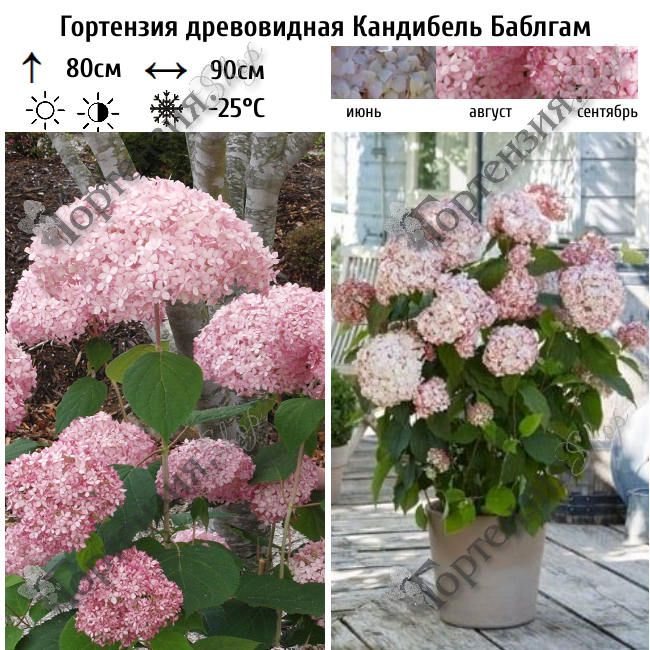 Куст компактный, округлой формы, высотой 80 см и шириной 90 см. Ветви сильные, хорошо держат соцветия. Во время цветения куст не разваливается. Цветки розовые. Соцветия шаровидные, крупные, плотные, 25–30 см в диаметре. Распускается нежно-розовым цветом, по мере распускания становится ярко-розовым. Цветение с июня по сентябрь