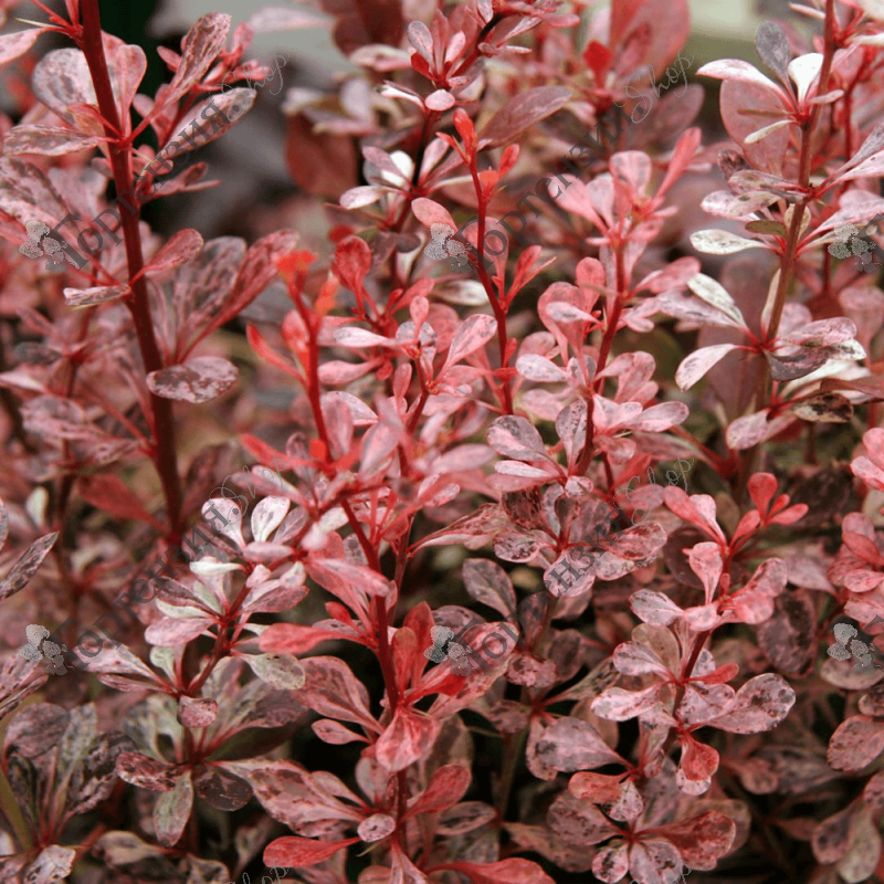 Барбарис Тунберга (Berberis thunbergii‘HARLEQUIN’) 'Арлекин' декоративный лиственный кустарник, достигающий до1,5 м в высоту и 1,2 м в диаметре. Отличается раскидистой, довольно крупной кроной с небольшими годовыми приростами и оригинальными пятнистыми листьями.Цветки одиночные или собраны в соцветия по несколько штук, внутри желтые снаружи красные, расположены по всему побегу.  Молодые побеги пурпурно-красные, позже - пурпурно-коричневые.Светолюбив.  К плодородию почв нетребователен.
