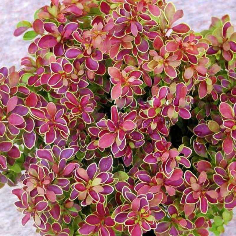 Барбарис 'Тунберга Голден Ринг', Berberis thunbergii «Golden Ring» - раскидистый колючий лиственный кустарник, с округлой, плотной кроной. Высота взрослого растения - до 2,5 м, диаметр кроны до 3 м. На побегах имеются шипы. Годовой прирост составляет 10 см в высоту и 15 см в ширину. Листья овальные, летом по цвету бордовые с жёлтой каймой, осенью - окрашиваются в насыщенно-красные тона. Светолюбив, Теневынослив. Засухоустойчив. Морозостоек.