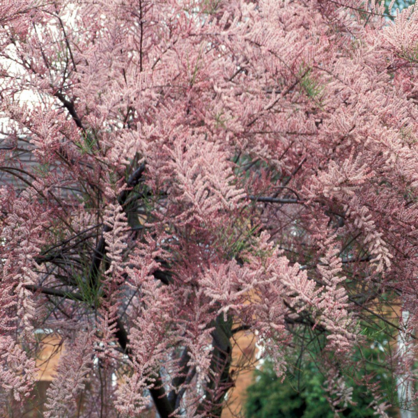Тамарикс разветвленный (Tamarix ramosissima) — светолюбивый красивоцветущий кустарник высотой до 3 м, в зависимости от  места произрастания. Годовой прирост 20 см. Листья серо-зеленого цвета, осенью ярко-желтые. Соцветия сформированы кругообразными бутонами, напоминающими бисер. Цветы мелкие, белого или розоватого окраса. Светолюбив, но может расти и в тени. К почве нетребователен. Кустарник тамарикс можно подстригать и использовать для формирования живых изгородей.