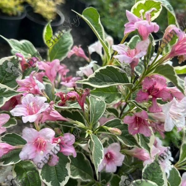 .Вейгела цветущая 'Санни Фэнтези' -  красивоцветущий кустарник высотой до 1,5 м, и диаметром до 1,3 м. Зеленые листья по краям окаймлены желтым. Цветки вейгелы появляются в июне-июле, ярко-розовые с лавандовой каймой, 3-4 см. Вейгела отлично дополняет композиции из хвойных растений, хорошо смотрится в групповых и одиночных посадках.
