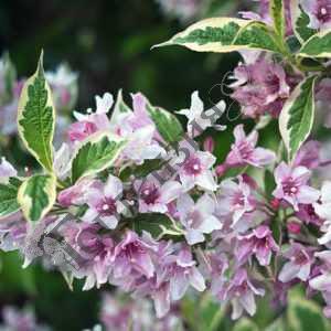Вейгела Санни Принцесс (Weigela florida 'Sunny Princess' ) -   красивоцветущий кустарник. Высота и диаметр кроны около 1,5 м. Зеленые листья по краям окаймлены желтым. Цветки вейгелы появляются в июне-июле, ярко-розовые с лавандовой каймой, 3-4 см. Вейгела отлично дополняет композиции из хвойных растений, хорошо смотрится в групповых посадках и одиночных. Почвы предпочитает плодородные, дренированные. Морозостойкость -29С.