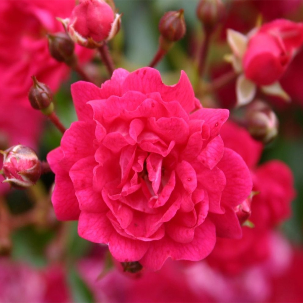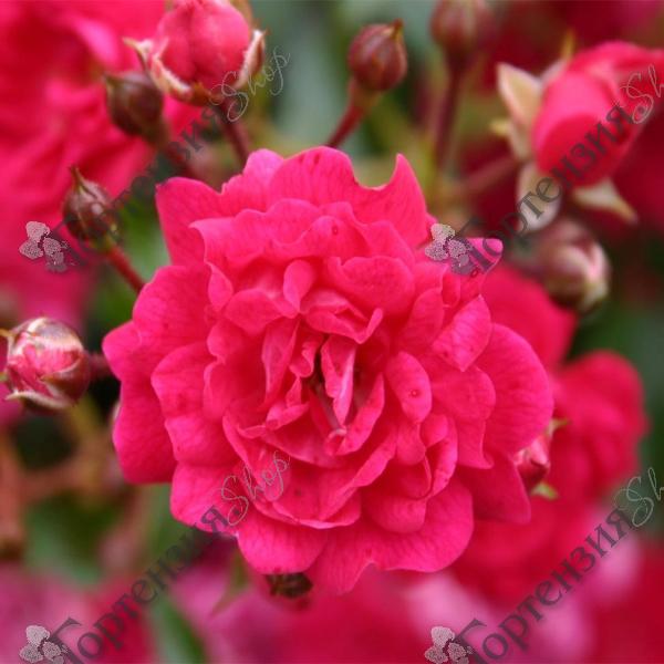 Садовая роза Fairy Queen Фейри Квин - Королева Фей - сорт полиантовой розы, открыт R.A. Vurens (Нидерланды.). Куст густой, высотой 50- 80 см, шириной 35 см, обильно цветущий множеством густо махровых округло чашевидной формы цветков темно розового, средне красного цвета, собранных в большие кластеры. Аромат мягкий, яблочный. Листва глянцевая, светло зеленая. Цветение волнами в течение всего сезона.