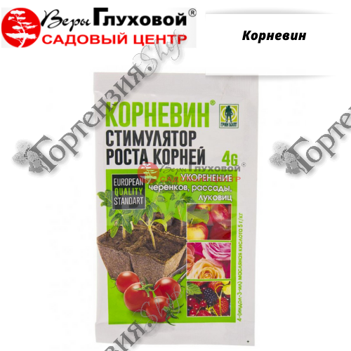 Корневин – это биостимулирующий препарат для растений в состав которого входит индолилмасляная кислота (ИМК) в концентрации 5 г/кг, которая, попадая на растение, слегка раздражает его покровные ткани, чем стимулирует появление каллюса («живых» клеток, образующихся на поверхности ранки) и корней.  А сама ИМК, попадая в почву, в результате естественного синтеза преобразуется в фитогормон гетероауксин, который, собственно, и стимулирует корнеобразование. Поэтому корневин действует медленнее, нежели гетероауксин в чистом виде, зато действие его более продолжительно.